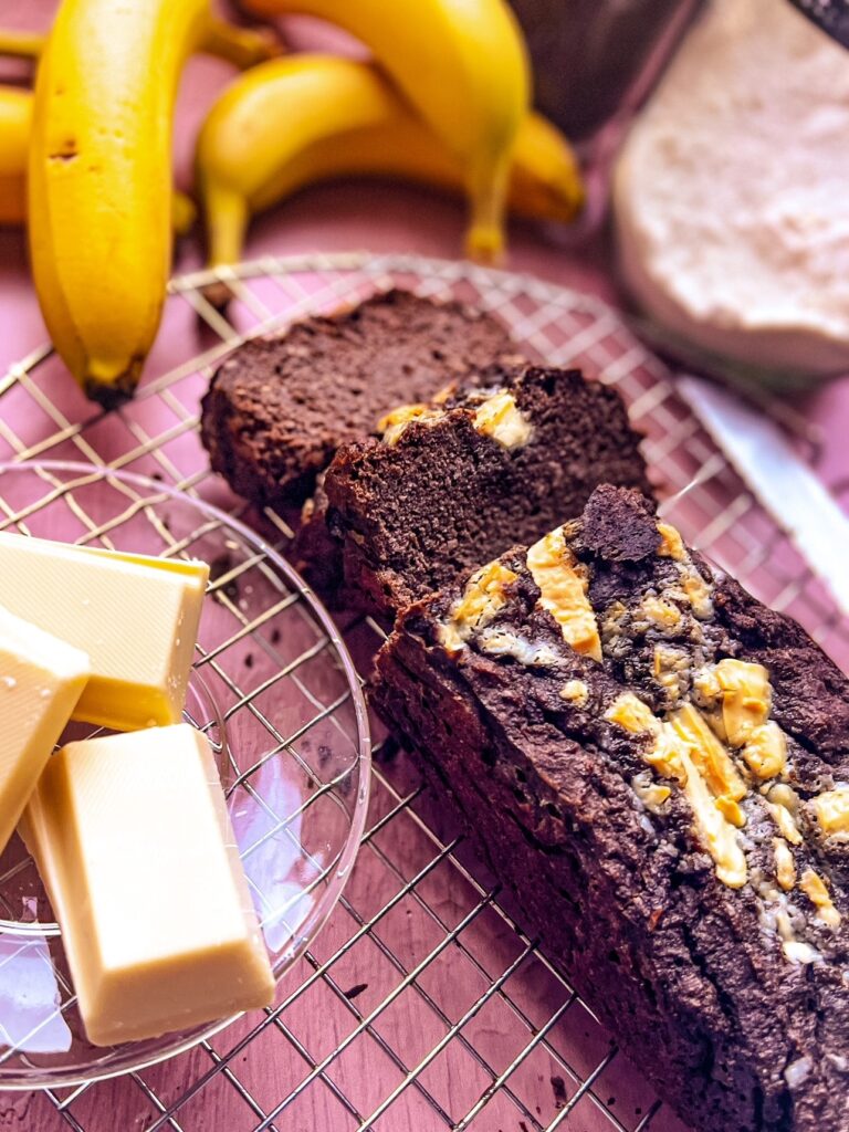 Μπανανοκέικ διπλό-σοκολατένιο, με μαύρη σοκολάτα στο κέικ και κομμάτια λευκής σοκολάτας επάνω. Με αυγά, βούτυρο αλλά λαιτ, αλεύρι καρύδας για χαμηλότερο υδατάνθρακα, γάλα λάιτ, προαιρετικά αλλά ιδανικά με προσθήκη πρωτεΐνης. Δεν περιέχει καμία προσθήκη ζάχαρης ούτε υποκατάστατο αυτής παρά μόνο τα σάκχαρα που προκύπτουν από τις ώριμες μπανάνες. Μάλιστα χωρίς γλουτένη αφού το αλεύρι καρύδας δεν περιέχει και ούτε τα υπόλοιπα υλικά (παρά μόνο σπάνια έχει ίσως η σοκολάτα και το κακάο ανάλογα με το εργοστάσιο παραγωγής). Είναι χαμηλό σε υδατάνθρακες με μόλις 15γρ ανά κομμάτι μερίδα 1/10 μπανανόψωμου, έχει καλή περιεκτικότητα ταυτόχρονα σε πρωτεΐνη 7γρ ανά τεμάχιο.