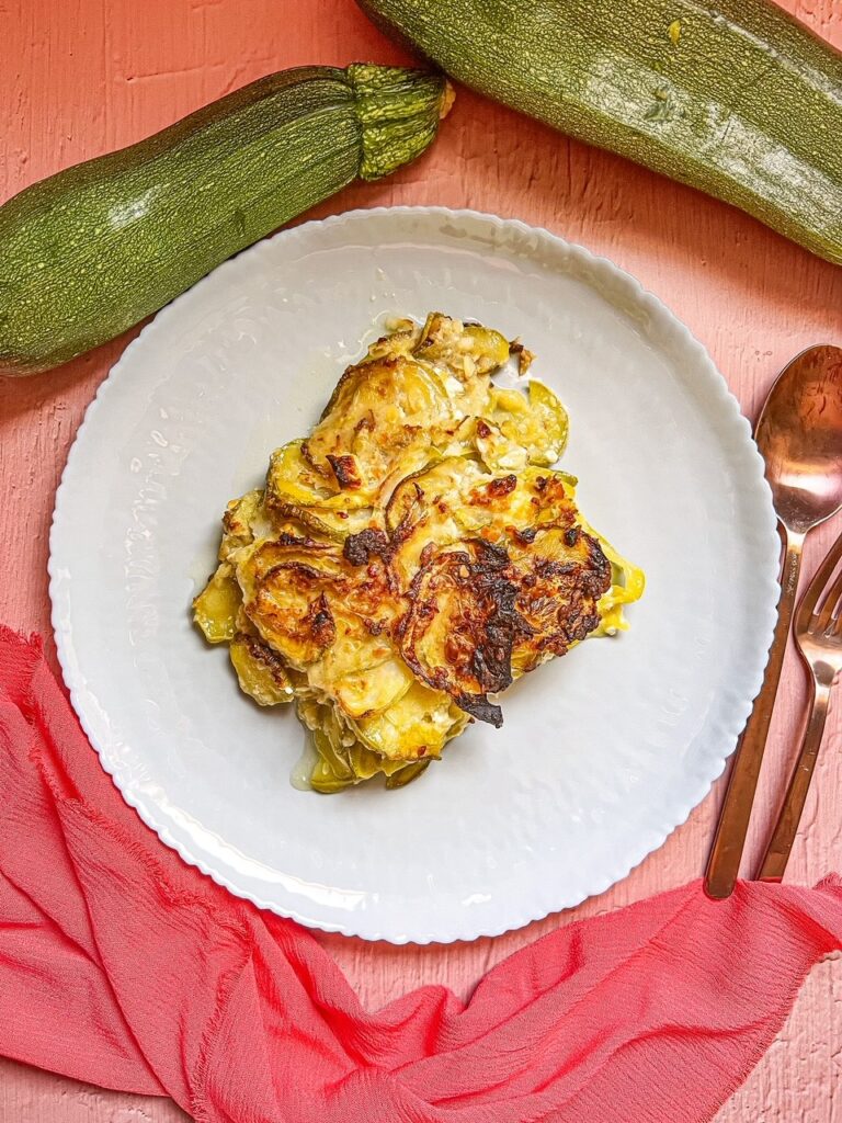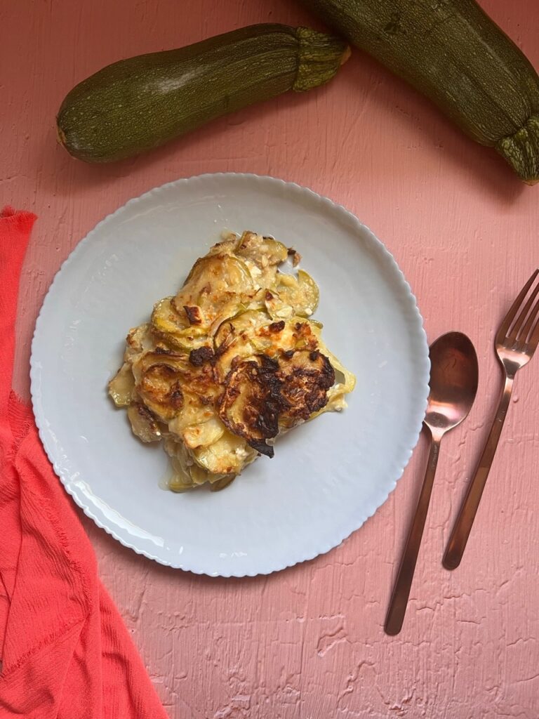 Είναι μία συνταγή που μας έφτιαχνε η μαμά μου τα καλοκαίρια που είχαμε πάντα πολλά κολοκύθια από τον κήπο του πατέρα μου. Είναι βασισμένη στο Χανιώτικο μπουρέκι, (η μαμά μου είναι από τα Χανιά) αλλά έχει απλουστευθεί αρκετά και η γιαγιά μου Όλγα είναι εκείνη που της έκανε την αρχική παραλλαγή. Τα τελευταία χρόνια που ασχολούμαι με την σύνταξη υγιεινότερων και ελαφρύτερων συνταγών έκανα τις αντικαταστάσεις μου και κατέληξα στην δική μου “λαιτ” εκδοχή της. Το σκεπτικό μου απλό, είναι μία συνταγή που έχει σε μεγάλο ποσοστό κολοκυθάκια που είναι τόσο χαμηλά σε θερμίδες αλλά και τόσο θρεπτικά παράλληλα. Έχει φέτα , εξαιρετικά παρθένο ελαιόλαδο και αλεύρι. Όταν όλα αυτά αναμιχθούν στις κατάλληλες αναλογίες, κάθε κομμάτι προκύπτει νόστιμο ελαφρύ και αποτελεί και γεύμα προετοιμασίας γευμάτων μιας και τρώγεται υπέροχα και κρύο, την επόμενη και την παρεπόμενη μέρα. Η ευκολία της συνταγής και η απλότητα των υλικών την κατατάσσουν στις πλέον αγαπημένες μας οικογενειακώς του καλοκαιριού.